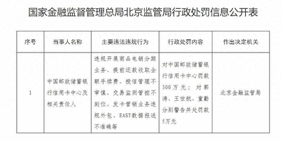 信网12月12日讯 近日,中国邮政储蓄银行信用卡中心因多项违规行为被北京金融监管局处以300万元罚款,相关责任人同步受罚。