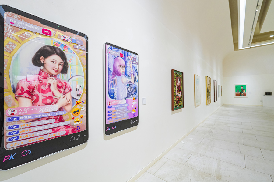 另一方面,是当代语境与观念带来的拓展。远看像经典月份牌,走近一瞧才发现是手机直播界面。徐琦遥的《永安百货直播中》巧妙地将月份牌嵌入一个“正在直播”的屏幕,构建起传统图像与当代媒介之间的对话。姜岑、姜建忠合作的《杜康平台》,运用水墨、油画、丙烯、纺织染料、铅笔、拼贴等综合性材料进行创作,以“带货直播”的穿越图式思考月份牌的当代表达,其艺术语言本身融入主观精神气质的意象表达,也带有当代趣味。日新月异的科技,则在陶奕颖、黄天维合作的《时影·重构》中有了显影。她们带来的是一组亚克力材质的月份年画塔罗牌,将传统的上海月份牌年画与深受时下年轻人欢迎的塔罗牌结合,营造出老上海风味的奇幻塔罗世界。创作过程中,作品不仅运用AI技术,也融入AR手法融入创新风格,邀请观众拿起手机扫一扫,进入全息的虚拟时空,获得与传统进行交互的独特体验。
