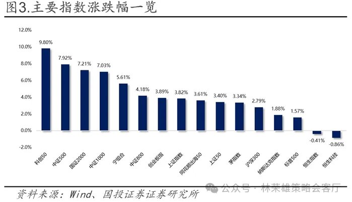 上周上证指数涨3.82%,沪深300涨2.79%,中证500涨7.92%,创业板指涨3.89%,成长风格表现强于价值风格,小盘股涨幅居前。上周全A日均交易额28429亿,环比前一周大幅上升。