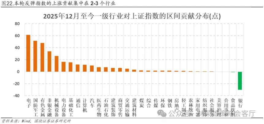 1、可以看到,跨年行情中围绕科技(商业航天、CPO、AI应用营销GEO)-资源品(贵金属与工业金属)-顺周期(化工、机械设备、风电)-金融(非银)轮番上阵,各显神通。从核心指数角度,以中证500、国证2000和中证1000这类中小盘指数为代表明显高于11月份高点,偏股混基金指数涨幅和万得全A指数相接近;创业板指和沪深300刚刚回到11月份高点,港股科技则明显低于11月份高点。行业层面,电子、军工和有色三个行业累计推动上证指数上涨160点,贡献12月下旬自低位以来超过一半的涨幅。