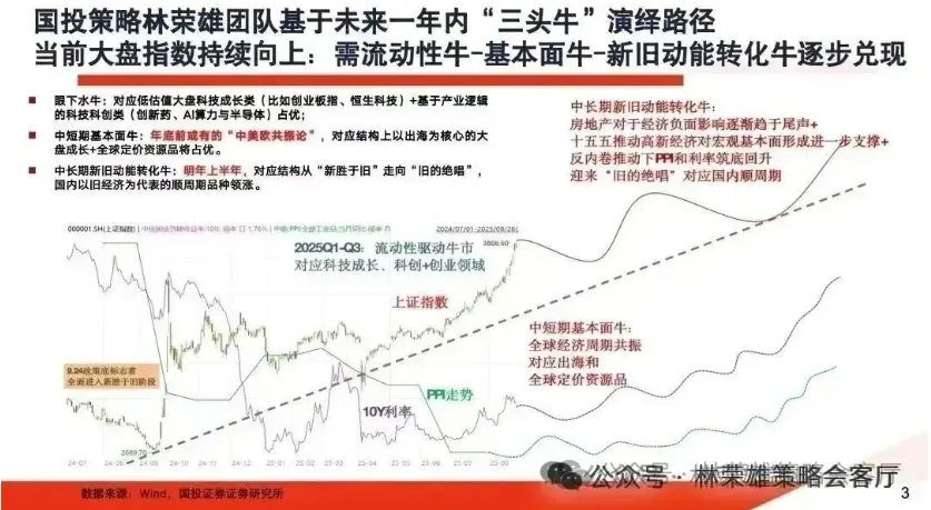 国投策略林荣雄团队认为,本轮牛市核心逻辑是“新旧共舞”。“新”指AI科技向下游走,投资重心从算力、AI半导体转向人形机器人、智能驾驶、AI应用营销等下游应用突破;“旧”指出口出海向上游走,传统行业通过高端制造和海外业务获得新动能,重点关注有色金属、化工、工程机械等出海和全球定价资源品。市场需从流动性牛向基本面牛过渡,结构从“八仙过海”收缩为“四大金刚”。