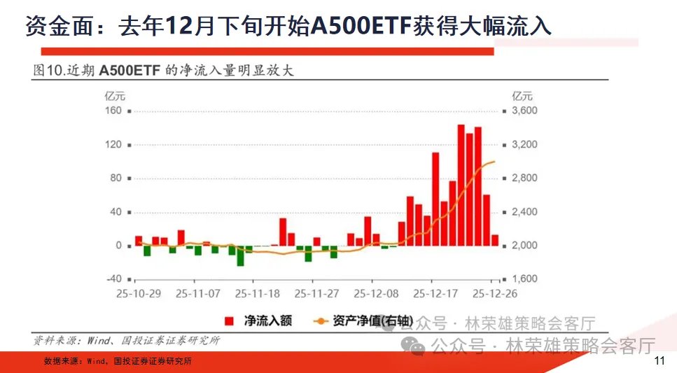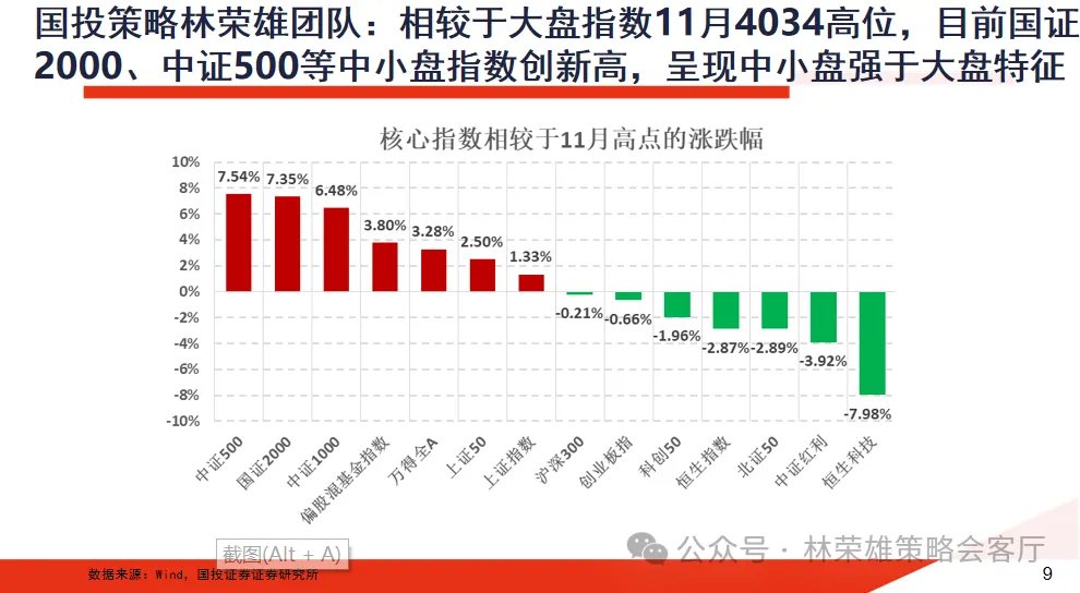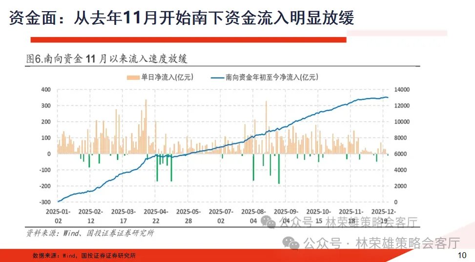2、同时,可以看到,在“八仙过海”中我们依稀可以分辨出资金正在作积极调仓:1、量化资金和ETF资金涌入支撑期间最强的国证2000指数和中证500指数;2、南下资金在去年11月之后大幅减弱,在12月甚至出现流出,北向资金则呈现交易活跃度获得一定上升;3、银行股持续疲弱,而非银中保险在深度重估;4、科技内部从此前缩圈抱团核心产业趋势强基本面保障品种再次适当扩圈,追逐商业航天和AI应用等下游品种;5、出海+全球定价资源品(有色、化工、工程机械、电力设备)则存在稳定资金持续流入。