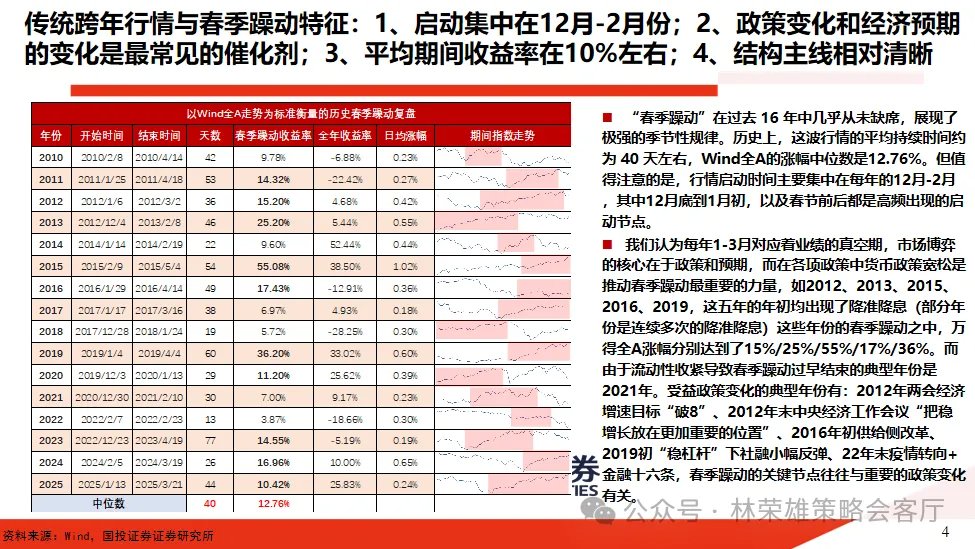 第二问:连阳之后?基于历史统计,跨年期间5%涨幅可以因情绪而涨(大致前高附近),5-10%可以因增量资金而涨,自去年12月中旬低位起算大盘指数收益超越7%,突破此前我们预想的强势震荡框架(3800-4050)。在此,我们依然认为此前两个预判框架并没有出错:1、当前要站稳4000点持续向上需要流动性牛向基本面牛过渡;2、超过10%的跨年大级别行情则需涨逻辑,“逻辑在哪里?”是春节前大盘持续超预期向上最需要直面回答的问题。