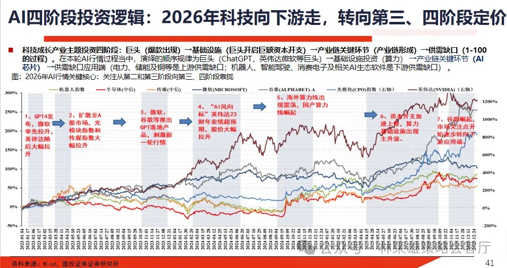 1、“新”指的是2026年当AI重大下游应用突破被视为科技反转定价,根据科技产业投资四阶段,此时由第二环节算力与第三环节AI半导体转向大幅增仓第四环节即产业链1-100过程中的供需缺口(人形机器人、智能驾驶与AI应用营销,消费电子、电力设备与储能);
