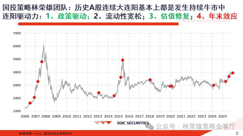 第一问:何以连阳?在大盘8连阳后,我们在周报《八仙过海》给出解释是:存在一定量的增量资金,但最重要的是当前市场较为普遍地认为2026年大盘存在向上空间,在12月下旬跨年定价环境整体还行中先下手为强,各类资金开展在各个方向的抢跑抢筹定价,这种看涨预期的自我实现造就本轮“非典型”春季躁动。