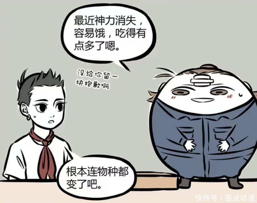 杨戬表示自己神力消失,所以容易饿,吃得东西也有点多。这是一不小心,都没给哪吒留一份,他还表示抱歉。不过哪吒只是觉得杨戬这一波变化,连物种属性都已经改变了。