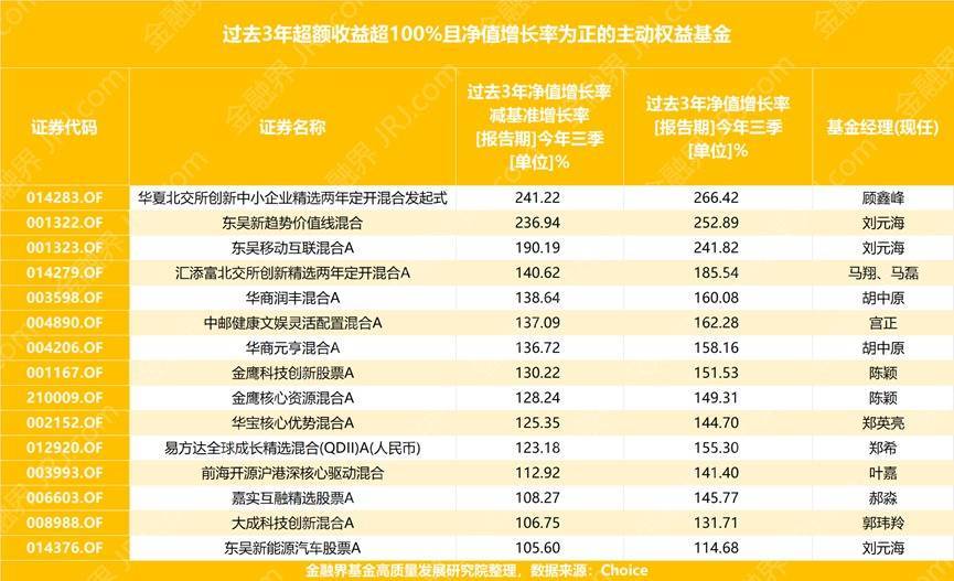 金融界基金高质量发展研究院结合基金三季报进一步梳理,截至12月15日,管理三年以上的主动权益基金里,15只过去3年净值超基准收益100%且收益为正,相关基金经理最有可能涨薪。其中,华夏基金顾鑫峰管理的华夏北交所创新中小企业两年定开混合发起式基金近3年超额收益率241.22%,3年净值增长超266%;东吴基金刘元海管理的东吴新趋势混合、东吴移动互联网混合A近3年超额收益分别达236.94%、190.19%,其管理的东吴新能源汽车股票A近3年超额收益也突破100%(105.60%),是上榜产品最多的基金经理。此外,华商基金胡中原、金鹰基金陈颖各有两只产品上榜,胡中原管理的两只基金近3年超额收益均超136%,陈颖管理的两只则均超128%。