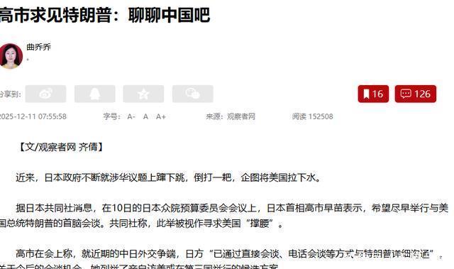 雪上加霜的是,她领导的少数派政府本就因政治献金丑闻焦头烂额,如今公信力彻底崩塌,执政根基摇摇欲坠。 走投无路的高市早苗,把所有希望都寄托在了美国身上,公开喊出“无论在何处见面都可以”的诉求,那份急切几乎溢于言表。 有趣的是,深谙日本“读空气”文化的高市早苗,这次却像完全摸不透美方的心思。