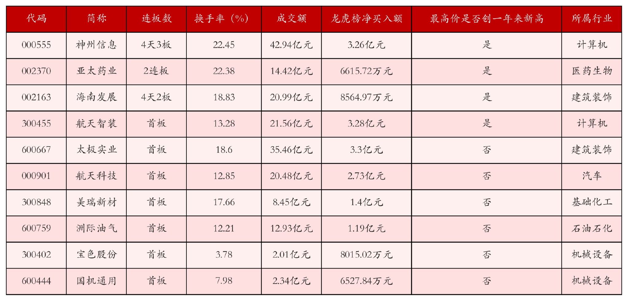 截至11月3日收盘,上证综指上涨0.55%,收于3976.52点,深证成指上涨0.19%,收于13404.06点,创业板指上涨0.29%,收于3196.87点。今日沪深两市A股共计91只涨停,综合当前连板数以及当日龙虎榜数据,其中较为强势的前三只个股分别为:神州信息(000555)、亚太药业(002370)与海南发展(002163)。今日强势个股前10位具体数据见下表: