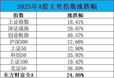 今天为2025年最后一个交易日,A股主要指数中,上证指数年涨幅为18.41%,深证成指年涨幅为29.87%,创业板指年涨幅为49.57%,沪深300指数年涨幅为17.66%,上证50年指数涨幅为12.90%,科创50指数年涨幅为35.92%,上证100指数年涨幅为19.42%,北证50指数年涨幅为38.8%创历史新高;东方财富全A指数年涨幅为24.86%创历史新高。(格隆汇)